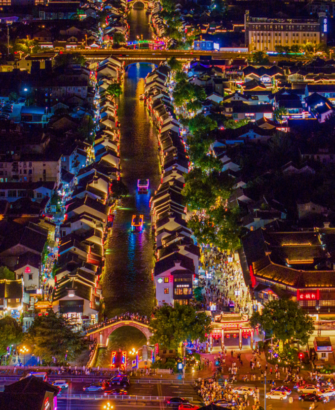 故郷を離れ北京に戻る前、私は再び清名橋の上に立ってみた。古い運河は北へと流れ、岸辺の魚灯にはすでに明かりが灯っている。赤や金の光が水面に映り、さざ波とともにゆらゆらと揺れている。遠くでは、いくつかのオフィスビルの明かりも灯り、水辺の民家の灯火と互いに照らし合っている。橋の上を時折散歩の人が通り過ぎるが、その歩みは穏やかにすること、急ぐ様子もない。
