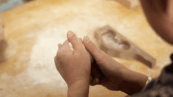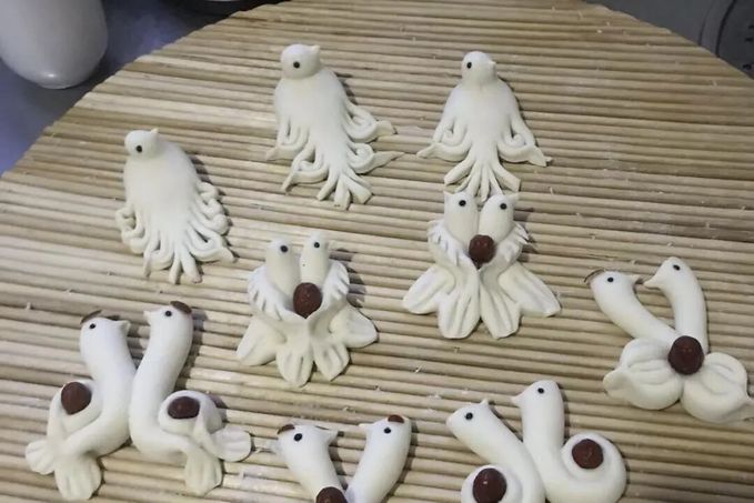 生地は母親の手の中で、一つ一つ丸々とふっくらした白い塊へと変わっていく。木型を使って鯉の形を打ち出し、櫛で鱗の模様を押しつけ、ハサミでハリネズミの針を切り出し、ナツメを埋め込んで花びらを作り上げていく。