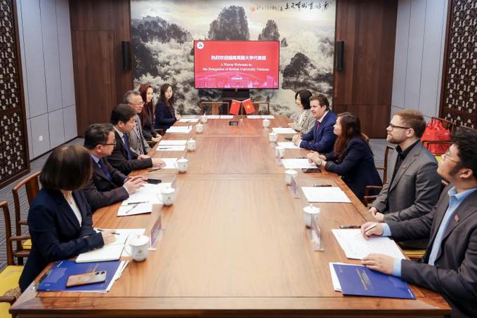 ベトナム英国大学(BUV)のグエン・ティ・ヴィン・トゥイ副学長、ラッツ大学院院長、ビジネス系大学院プログラム学科責任者のタ・ディン・ディン、学術サービス・学生事務主管のチャン・ドゥック・チュンらが同行し来訪した。本校からは、国際伝媒教育学院の金雪涛院長、国際交流・協力処の王文淵処長、張佩佩副処長、外国言語文化学院の李方妮講師らが会見に出席した。